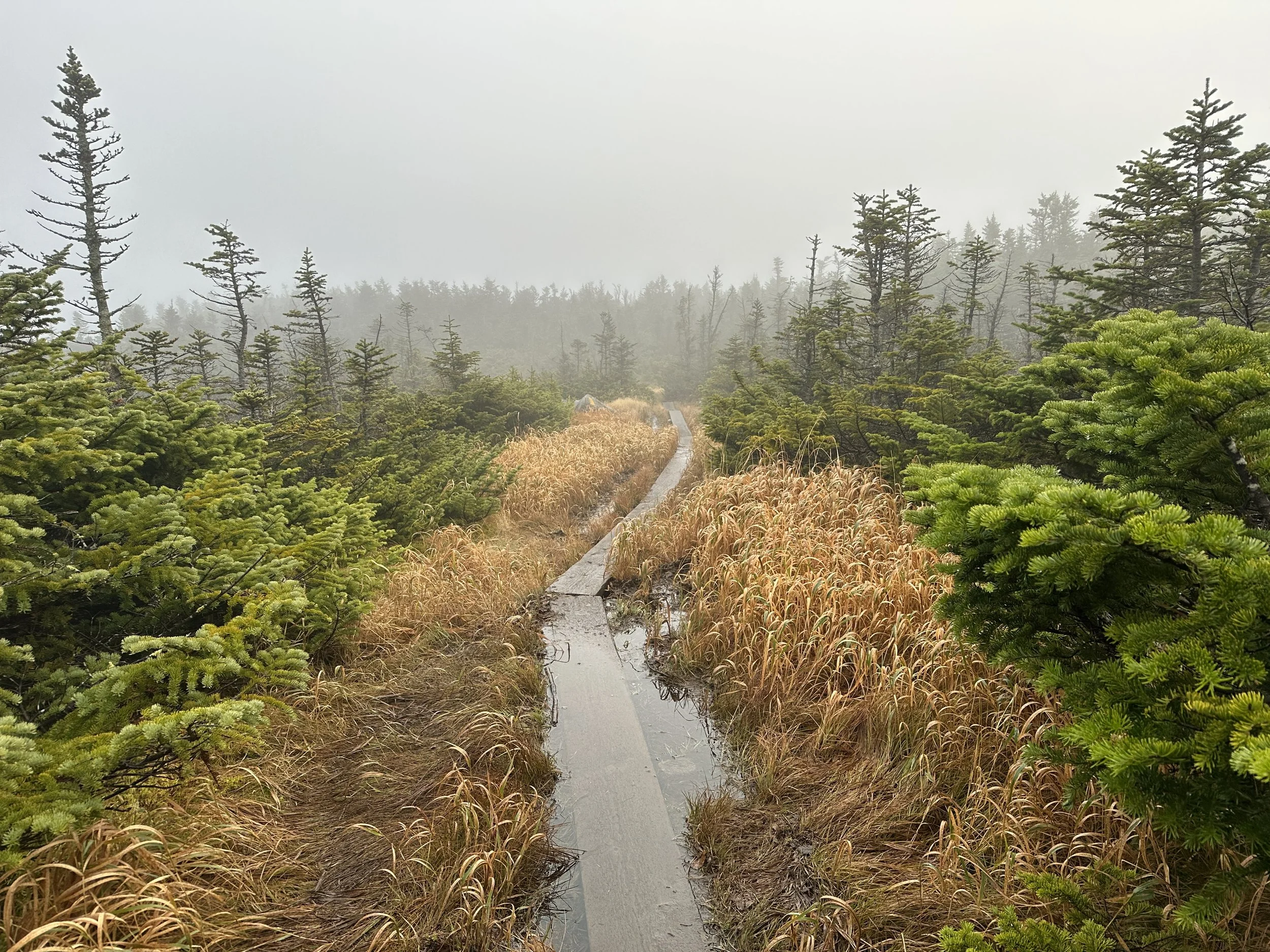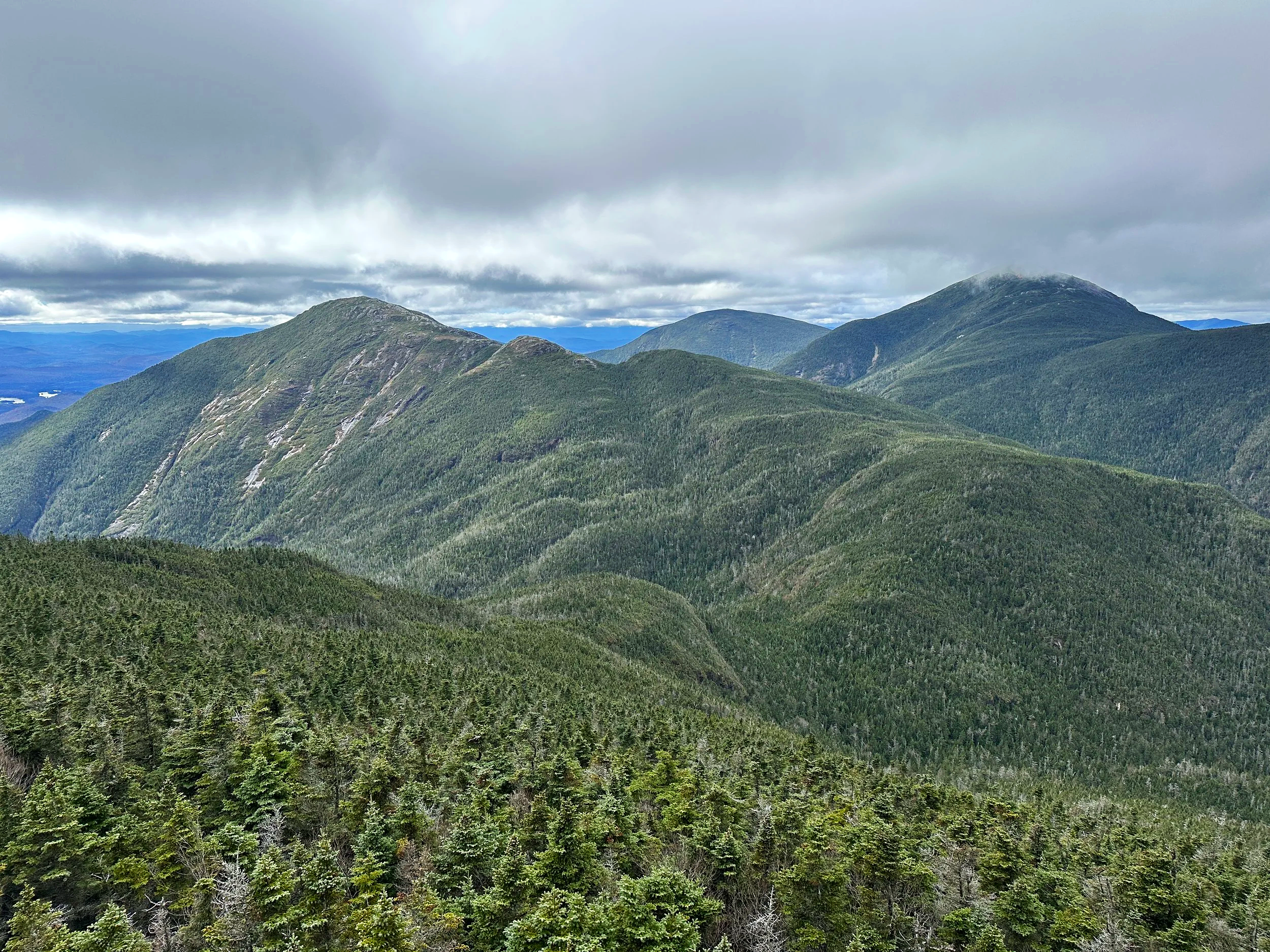 We descended over 1,000 ft before having to summit Little Haystack (4,662’) en route to Haystack. The last stretch along the Haystack Trail led us there. Haystack stands at 4,915’ and was a new summit for me. This one came with a sliver of an opening in the sky’s parting clouds. Some bits of foliage remained in the distance, and we could see Mt. Marcy was clearing up a bit as well.
